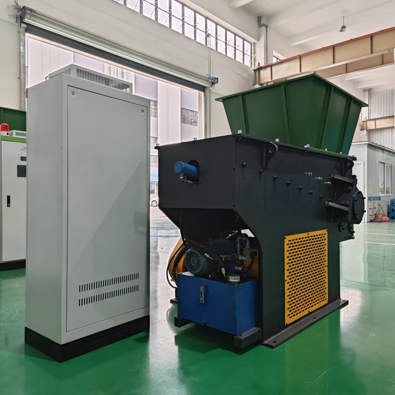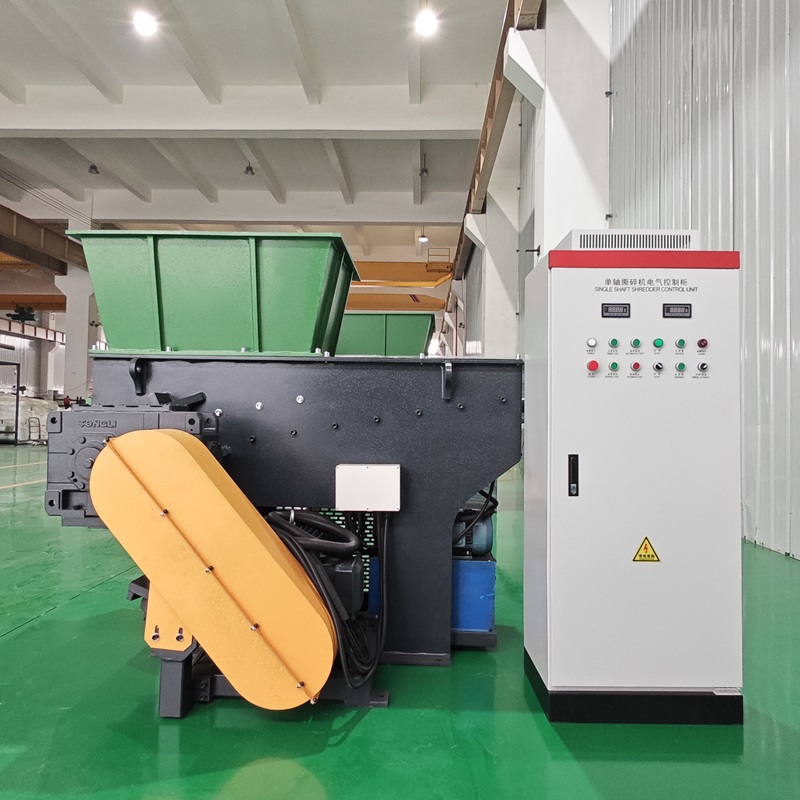 La trituradora de un solo eje consta de un motor, un reductor de dientes duros, un eje de cuchilla giratoria, cuchillas móviles importadas, cuchillas fijas, un marco, una base, una caja, un cilindro hidráulico, una bomba de aceite y otros componentes principales.